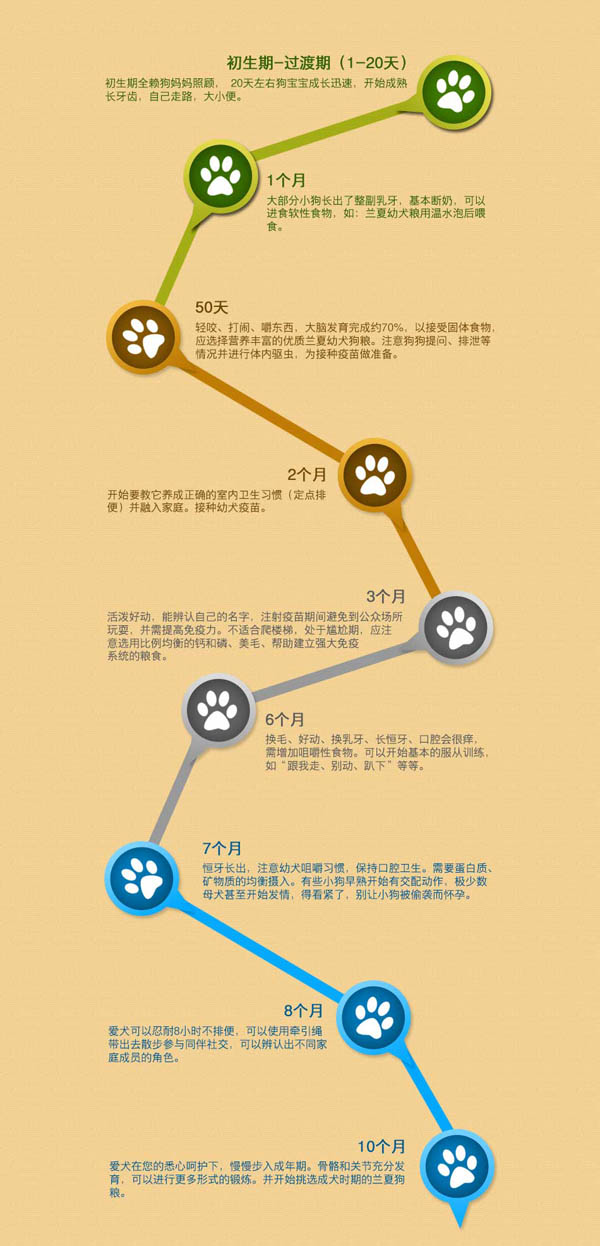 初生期-過渡期(1-20天),初生期全賴狗媽媽照顧, 20天左右狗寶寶成長迅速,開始成熟長牙齒,自己走路,大小便。